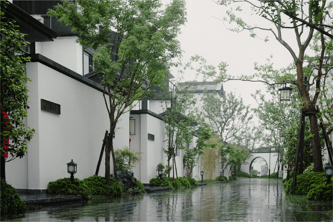 有别于保守中式的冷寂,仙女湖小镇的院墅产物呈现出更为典范的现代感。好比,中式大屋顶笼统为简约轻盈的形态神韵;院墙正在保留山地平易近居情怀的前提下,以石材取玻璃等材质,山势呈现出奇特的时代气味;门窗正在保守范式根本上,增大了开间标准,尽可能将阳光取风光送入室内。