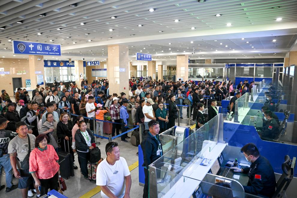 2024年9月11日,搭客正在二连浩特公港口联检大厅打点通关手续。记者 贝赫 摄。